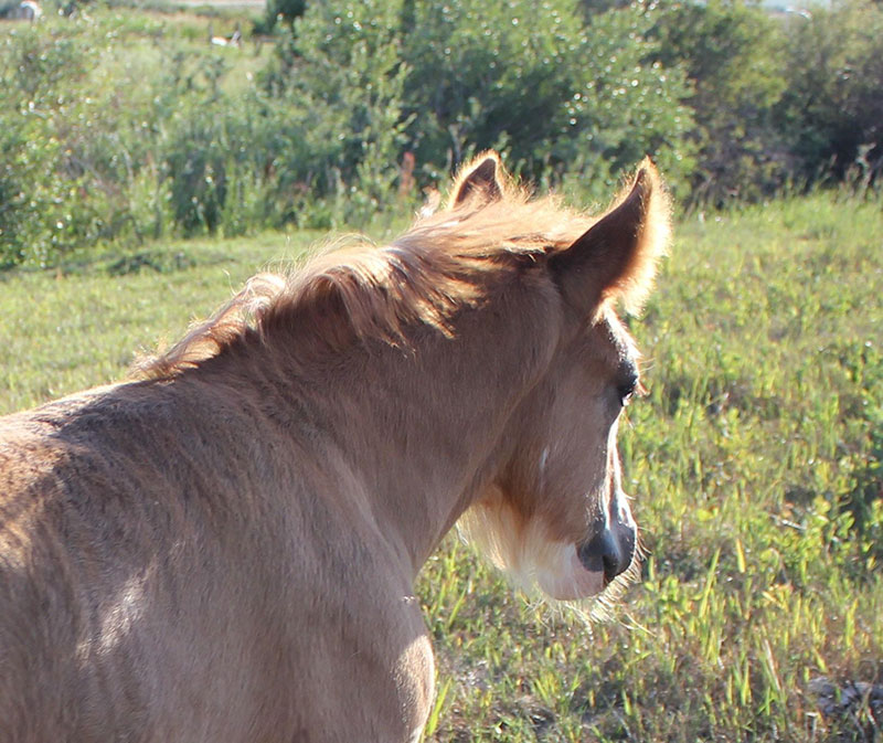We have decided to watch Dantae’s boy and see how he develops. Guapo is a Tumbleweed and Aslan grandson who looks to have a ton of stallion potential. He is exceptionally well built and is a stunning buckskin color. He loves his snuggle time, is quiet and observant and has that lucky white ear. He should mature to about 14.1hh.